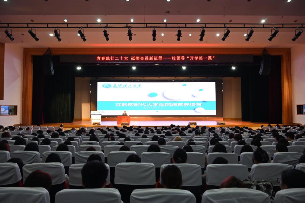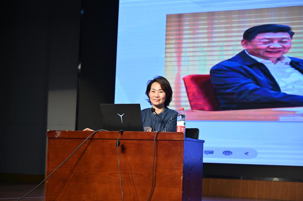 4月20日晚,校党委委员方琼在金盆岭校区五教大会堂为文新学院学生讲授“青春践行二十大、砥砺奋进新征程”开学第一课。院领导刘建新、陈仁凯、刘莎等出席。