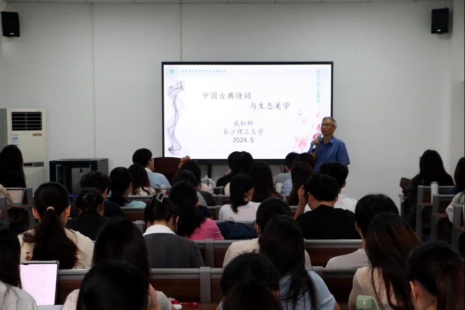 2024年5月21日下午,威廉体育williamhill文新学院通识讲座暨人文素质大讲堂之“中国古典诗词与生态美学”专题讲座在金盆岭校区9教417室举行。湖南省人民政府参事、中文系二级教授成松柳老师为长理师生带来了一场富有人文气息的古典诗词盛宴。成松柳教授首先对“古典诗词生态美学的艺术呈现”进行了阐述。他将中国古典诗词生态美学的呈现方式分为“自然本身的和谐”、“人与自然万物的和谐”、“人与社会的和谐”三个方面,以李白、王维、刘禹锡、张孝祥、朱熹等人的传世诗词为例,围绕“楼观岳阳尽,川迥洞庭开”“相看两不厌,唯有敬亭山”“空山不见人,但闻人语响”“试问西山雨,何如湘水春”进行了诗意解读,详细阐释了“主客一体”“仁爱万物”“江山之助”“天地境界”等观点。成松柳教授提出:中国古代诗歌并非纯粹客观地描摹自然风物,古代文人将浓厚意趣与真挚情感熔铸于自然山水,体现了对自然的审美感知,这种与自然的亲近友好关系承载着博大深沉的生命情怀。