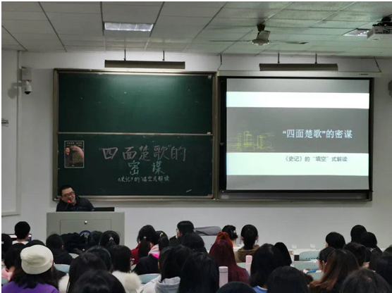 讲座伊始,王勉老师首先提出一系列具体问题,引导同学们进入“垓下之战”的情境。其间,王老师讲述悬疑小说式的语调,引起了同学们极大的好奇。接着,王老师主要通过解决战争地点是“垓下”还是“陈下”、项羽的“大惊”是有意还是无意、四面楚歌中的“楚歌”指什么、《垓下歌》的意义、“围之数重”与“溃围南出”这一矛盾与“四面楚歌”的意图这一系列问题,解谜式推进文本的解读,层层推进。最后,在同学们陷入沉思之际点出隐藏的主题:光明磊落的失败者与相互猜忌的胜利者。