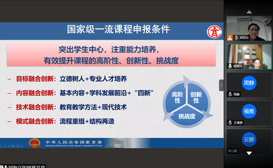 二、联系实际,指导性强。在讲座中,胡教授分享了自己任教的“唐宋诗词与传统文化”课程从申报与建设校级金课、省级金课到国家级金课的经历,还着重联系国家一流本科专业建设对于课程与教材建设的各项指标与要求、第五轮学科评估对课程建设与教学质量的各项指标与要求,以及2020年国家一流本科课程、湖南省一流本科课程申报中五类课程评审的指标与要求,对如何建设和申报金课提出了建议,具有很强的针对性和可操作性。