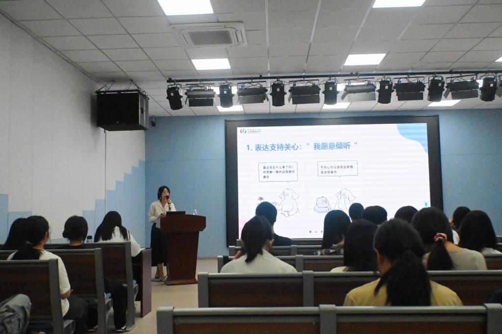 首先,卢灵舢以“你会安慰人吗?”这一问题引出会议主题,通过互动调动了会议氛围,为大家介绍了五种安慰的方法。接着,她阐释了朋辈互助员的三个助人技巧,并展示了两个思考题,让大家发表自己的看法,学以致用。最后,卢灵舢讲到了朋辈的职责和边界,告诉大家应该及时注意并上报同学们的异常状态,做到早发现早上报,协助老师完成工作。