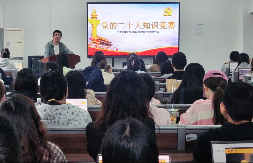 为贯彻落实党的二十大精神,积极探索“党建+互联网”新模式,进一步提升积极分子的理论知识水平,10月16日12时30分,“党的二十大知识竞赛暨文新学院2024年秋季发展对象推优考试”于威廉体育金盆岭校区九号教学楼417室成功举行。