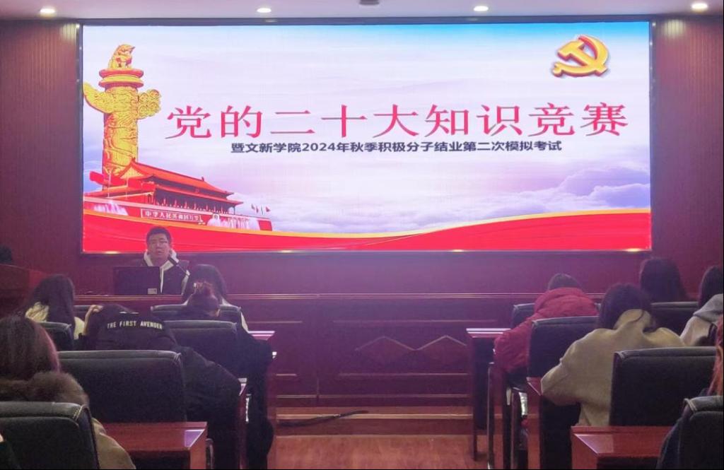 为贯彻落实党的二十大精神,积极探索“党建+互联网”新模式,进一步提升积极分子的理论知识水平,11月25日12时10分,“党的二十大知识竞赛暨文新学院2024年秋季积极分子第二次模拟考试”于威廉体育金盆岭校区九号教学楼218室成功举行。