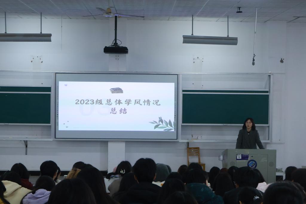 李婵对23级总体学风情况进行总结。她肯定了全体同学过去一年所取得的各项成绩,同时也从专业学习、素质提升、日常管理等三个方面指出了目前存在的问题。她希望今后全体同学能进一步提高思想认识,加强学习实践,营造更加积极向上的班风和学风。