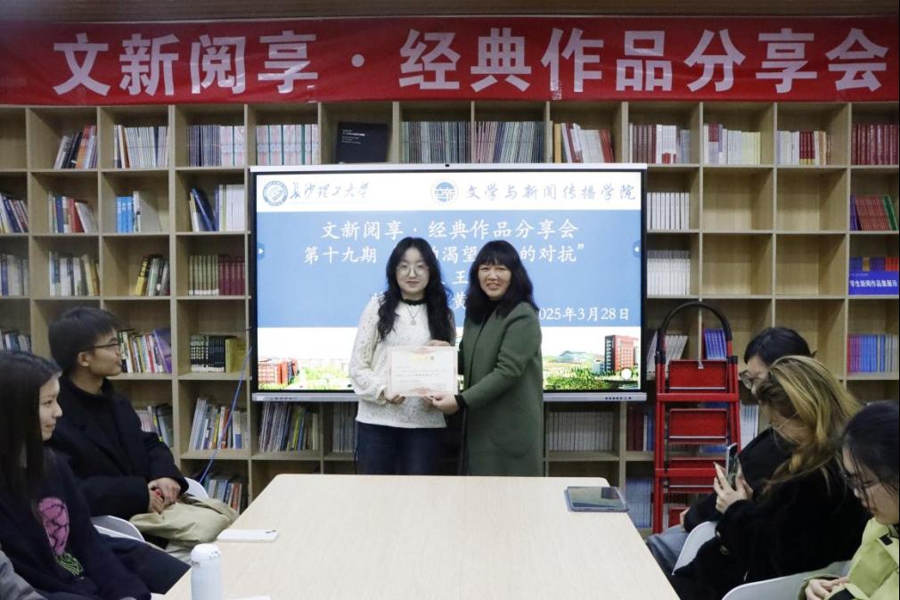 活动最后,黄宇老师为王紫瑞颁发“优秀主讲人”证书,并与参与者合影留念。此次分享会为同学们提供了一个交流讨论的平台,有助于同学们对文学作品的深入理解,并由此延伸到实际生活,体察自我人生。