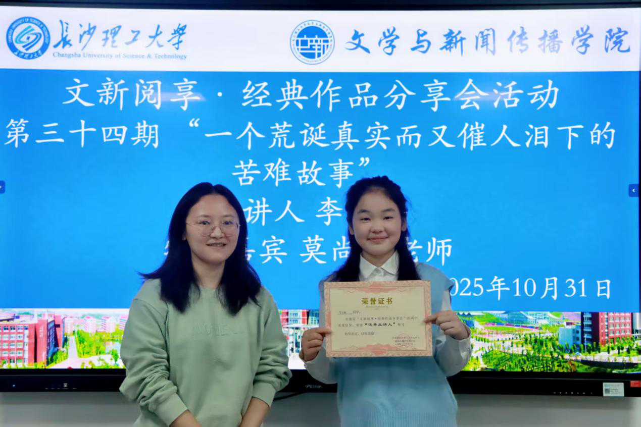 10月31日晚,文新学院第三十四期“文新阅享•经典作品分享会”在金盆岭校区九教223团体成长辅导室顺利举行。本期活动由汉语言2404班李东梅担任主讲,以“一个荒诞真实而又催人泪下的苦难故事”为题,深入剖析这部经典小说的人性内核与时代意义,中文系莫尚葭老师作为特邀嘉宾参与活动。