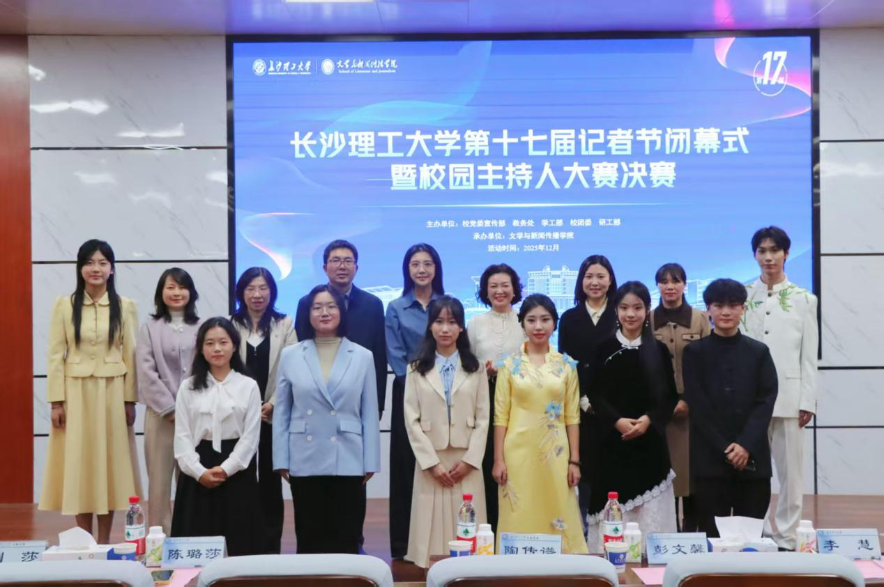 2025年12月19日19:00,由校党委宣传部、教务处、学工部、校团委、研工部主办,文学与新闻传播学院承办的威廉体育williamhill第十七届记者节闭幕式暨校园主持人大赛决赛在金盆岭校区四号教学楼108学术报告厅举行。山东广播电视台主持人彭文馨,湖南省朗诵艺术协会支部书记、全国“读书成才女职工”获得者李慧,校团委副书记(主持工作)陈璐莎,校学生工作部副部长陶传谱,校图书馆副研究馆员、国家汉办语合中心国际汉语教师、湖南省语委普通话测试员张雪梅,文新学院新闻系副教授、湖南省高校教学能手曾志华,文新学院党委副书记刘莎出席本次活动并担任评委。