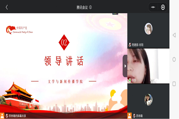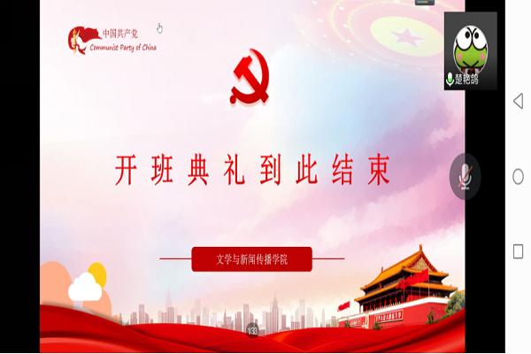 4月14日晚7点,文学与新闻传播学院线上方式本学期入党积极分子、发展对象、预备党员培训班开班仪式。学院党委副书记刘莎、党建辅导员楚艳鸽以及全部学员参加本次开班仪式,仪式由苏依璐同志主持。