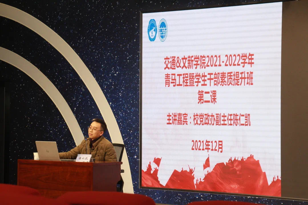 为提升学生干部的网络素养,培养学生干部对网络舆论的观察力和判断力,做新时代的网络文明青年,文新学院及交通学院2021-2022学年青马工程暨学生干部素质提升班堂理论课于12月29文科B300开讲本次课堂由校党政办副主任陈仁凯主讲,文新学院党委副书记刘莎、文新学院团委书记李敏出席,全体青马班成员参加。