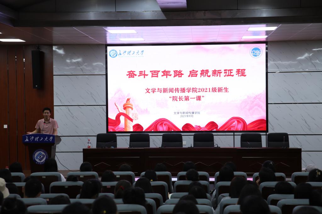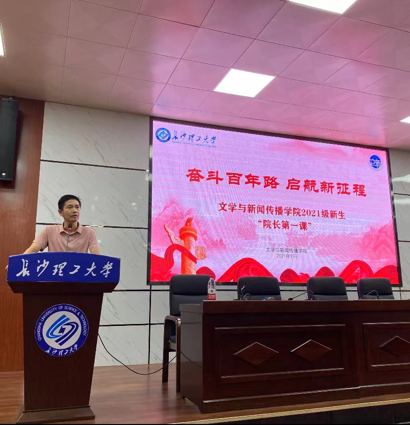 9月29日晚,文学与新闻传播学院2021级新生“院长第一课”在金盆岭校区四教报告厅举行。院长刘建新以“奋斗百年路,启航新征程为主题,为全院新生开展入学主题教育,助力新生们系好大学第一粒扣子。2021级新生辅导员陈鑫宇、各班班导及全体新生参与本次授课