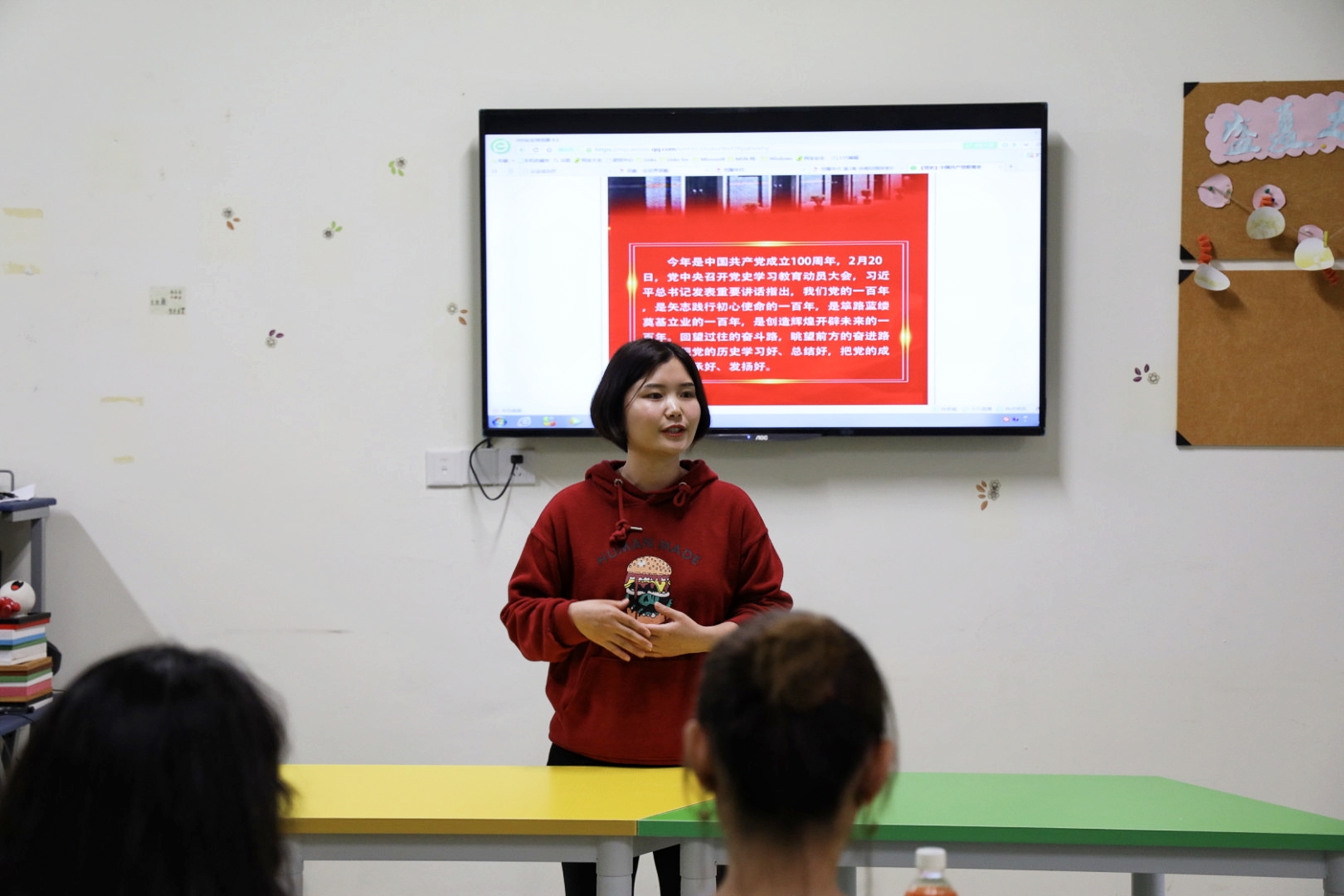 支部书记楚艳鸽向学生党员讲述了中国共产党简史,激励学生党员读党史学党史,鼓励大家勤思考敢发声。楚艳鸽希望大家在读原著、学原文中不断提高思想素养,把感性认识上升为理性认识,用正确思想的力量武装自己,指导实践。