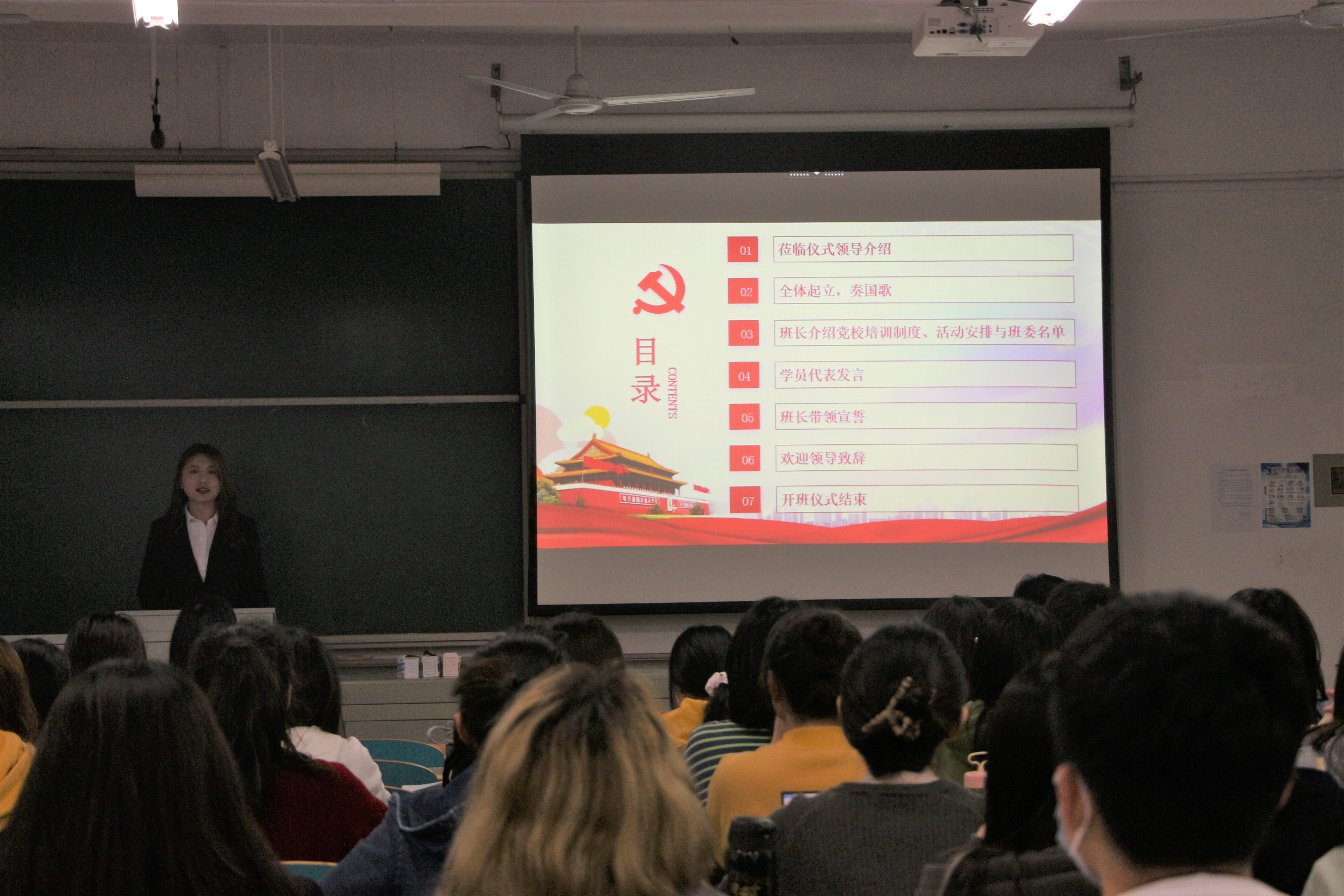 庄严地奏唱国歌后,培训班班主任刘洋介绍了发展对象培训班的培训制度、活动安排与班委名单,对在座的发展对象提出学习要求与纪律要求,希望同学们端正学习态度,从思想上、行动上早日入党。