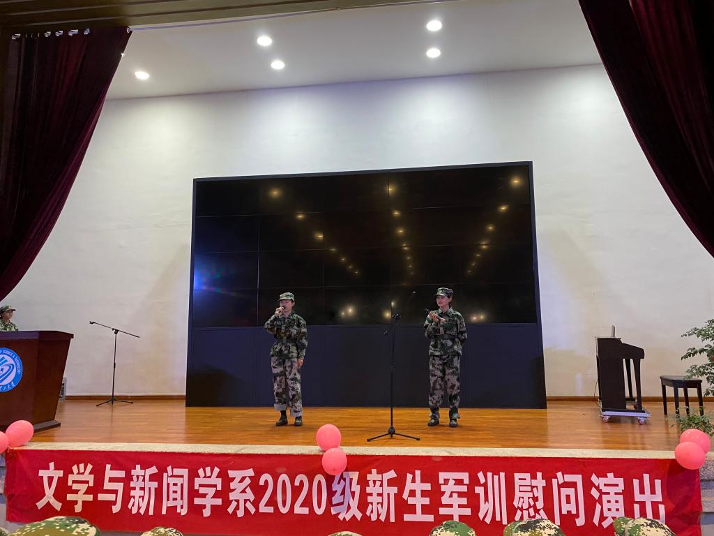 9月25日晚,文新系2020级师生在威廉体育williamhill金盆岭校区校友之家举办军训慰问演出。文学与新闻学系党总支书记伍接朝,系副主任周云鹏、魏桃初,系党委委员、中文系主任郑劭荣老师,系学工办主任、17级辅导员楚艳鸽、系团委书记吴笛以及2020级新生辅导员李敏到场。
