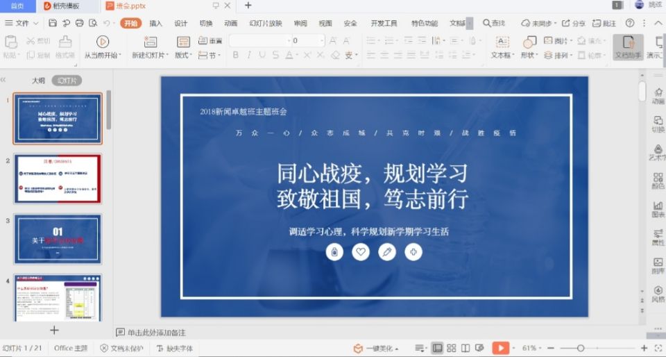目前,各班班会材料已收集完毕,线上心理健康教育主题班会圆满结束。此次班会有利于同学们共同了解前线疫情最新动态及防控知识,并针对开学后合理规划学习生活提供了一些建议,有助于同学们科学应对疫情带来的压力问题。(文:张莉,图:各班级,审:楚艳鸽)
