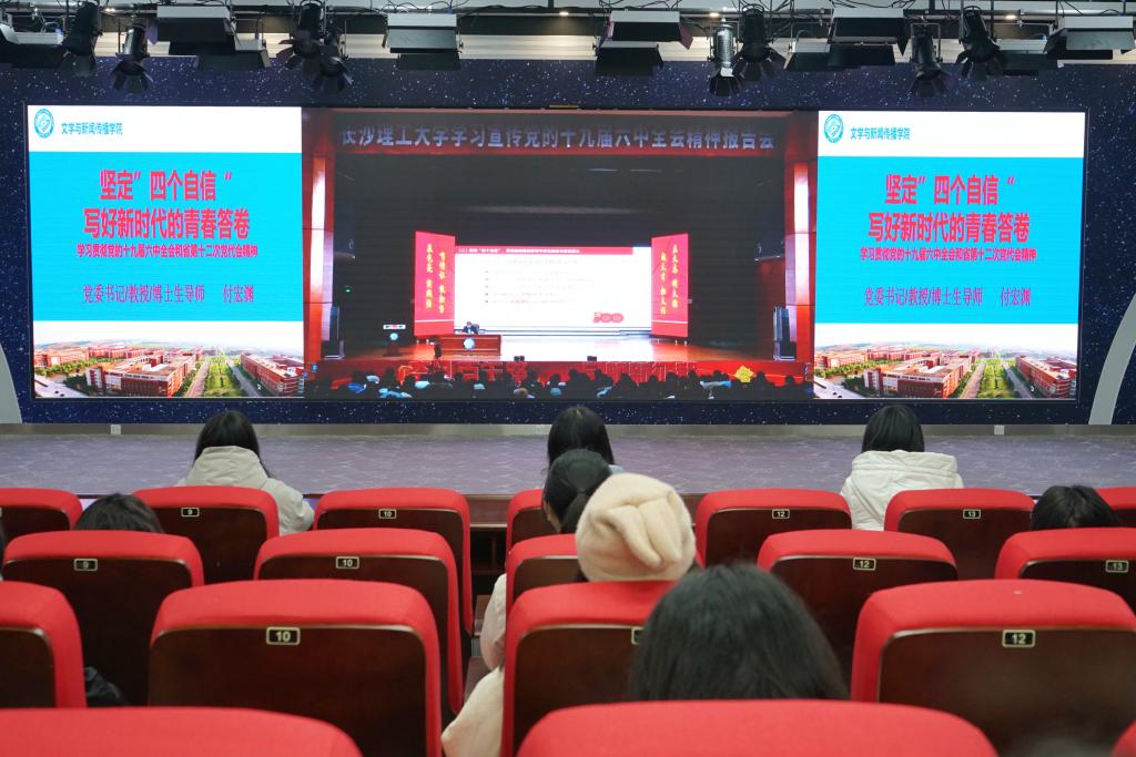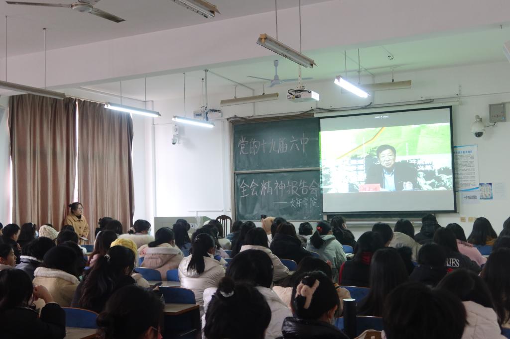 12月28日下午,学校举行学习宣传党的十九届六中全会精神报告会,校党委书记付宏渊作主题宣讲报告。我院党委副书记刘莎、辅导员楚艳鸽、吴笛、陈鑫宇、李敏及学生党员代表在云塘校区大会堂主会场参会,其他学生在学院分会场文科楼B300和金盆岭6教206集中收看现场直播。