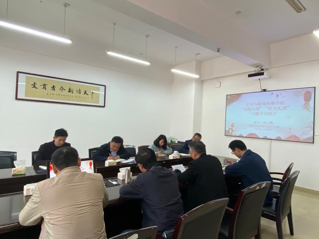 周云鹏领学了以上文件原文,并在主题发言中表示,担当精神是共产党人鲜明品格和必备素质,要不犹豫不懈怠不畏难,做推进落实学校党代会精神的奋进者,为构建幸福学院而努力;选择实干就是选择了责任和担当,要做起而行之的行动者,特别是在两个本科专业申报国家一流专业建设点、文化创意与湖湘文化国际传播研究中心建设等具体工作中,不做坐而论道的清谈客;要用“四心”守初心担使命,热心为师生服务,踏踏实实干好工作。然后,大家从不同角度畅谈学习体会和感受,一致认为,要增强斗争意识,进一步增强政治敏锐性;要提升斗争本领,引领师生坚定不移跟党走;要勇于自我斗争,不断改进自身短板,提升党性修养;要加强政治历练,遵守党内规矩;要加强实践锻炼,提升工作本领。
