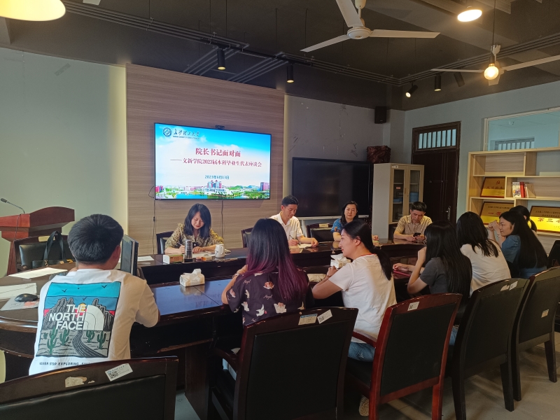 6月13日下午,文新学院召开“院长书记面对面”第五期——2023届本科毕业生代表座谈会,院长刘建新、党委副书记刘莎、副院长戴钰、新闻系主任赵继光、毕业生辅导员李婵出席,2023届本科毕业生代表参加。座谈会由刘莎主持。