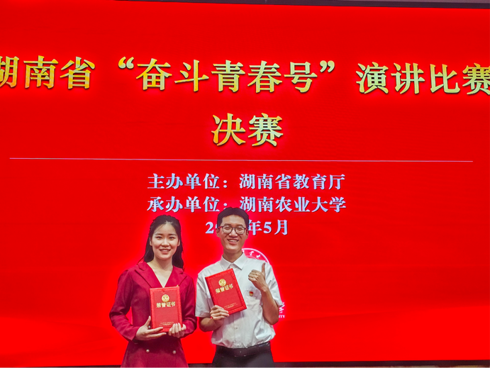 5月21日下午,湖南省“奋斗青春号”演讲比赛决赛在湖南农业大学落下帷幕。我院21级新传研究生赵冉、汉语言1904班冯严冬的个人演讲分别获得湖南省一等奖和二等奖,22级网新班汪卓等人的团体演讲获得湖南省三等奖。