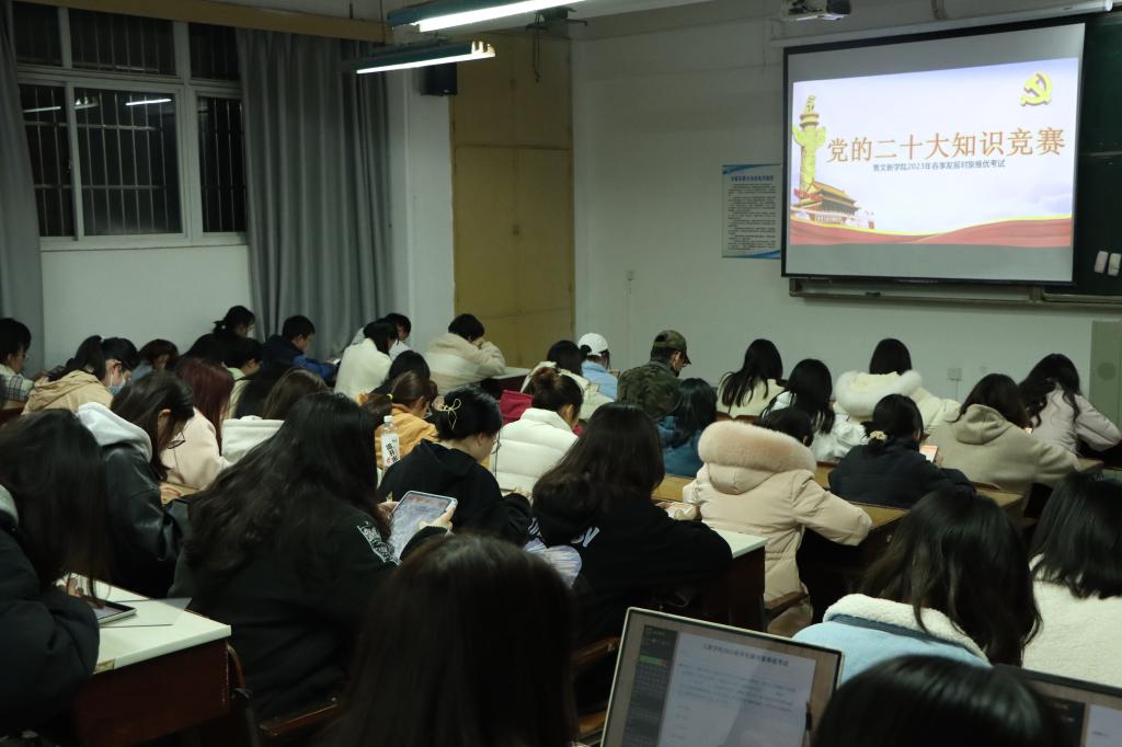 为深入学习与深刻贯彻落实党的二十大精神,积极探索“互联网+党建”新模式,进一步提升入党积极分子的理论知识能力水平,2023年3月28日晚7点30分,“党的二十大知识竞赛暨文新学院2023年春季发展对象推优考试”于威廉体育金盆岭校区三号教学楼成功举行。