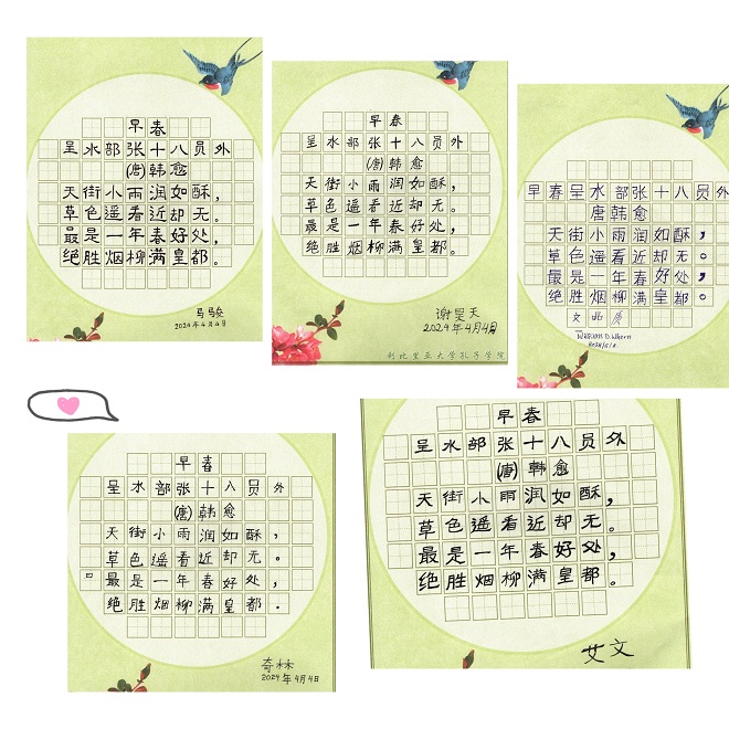 本年度国际中文日的主题为“中文:架起文明互鉴的桥梁”。在国际中文日来临之际,利大孔院举办以“春”为主题的书法比赛,用饱含春意的诗词让学生们感受汉字的魅力与春日的勃勃生机。