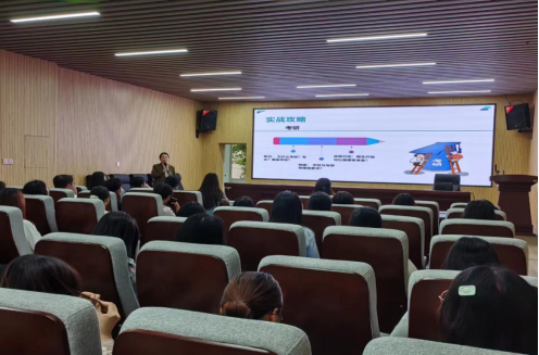 武巧琳从“外国语学院近年来考研形势”“实战攻略”“院校选择参考因素”三个方面为同学们进行考研经验分享。通过分析2015届—2024届学院本科生考研上线率和录取率,特别针对2023届和2024届考研情况,她强调考研需要“知己”、“知彼”,并表明学院会尽力支持考研学生,保障其学习环境和心理健康。