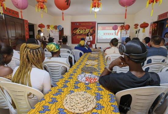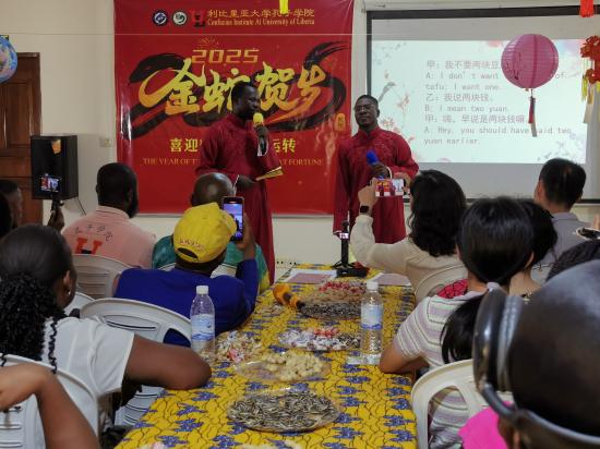 当地时间2025年1月25日,利比里亚大学孔子学院在中方教师驻地举办了一场热闹非凡的春节联欢会。此次联欢会吸引了援利医疗队、在利中资企业代表、孔院教学点负责人、众多师生、以及利国中文爱好者们的热情参与,近百人欢聚一堂,共庆2025中国农历新年的到来。利比里亚多家知名电视、广播及主流网络媒体对本次春节联欢会进行了全程直播及新闻报道。