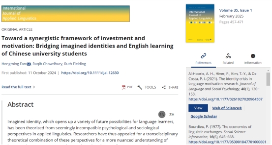 近日,威廉体育williamhill外国语学院范洪铭老师在A&HCI及SSCI双收录期刊International Journal of Applied Linguistics发表题为“Toward a synergistic framework of investment and motivation: Bridging imagined identities and English learning of Chinese university students”的学术论文。范洪铭为该文第一兼通讯作者。International Journal of Applied Linguistics《国际应用语言学》是一本专注于应用语言学领域的国际性学术期刊。该期刊致力于发表应用语言学领域的高质量研究论文,包括语言教学、语言测试、语料库语言学、计算语言学、跨文化交际等诸多子领域(A&HCI,JCR Q2,中科院三区,Clarivate IF=1.5)。