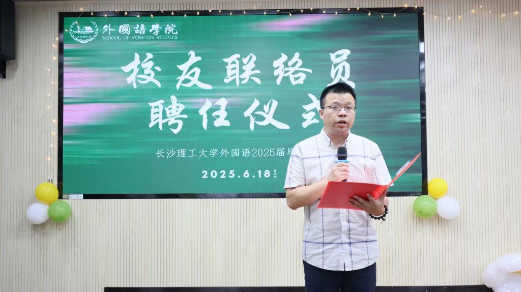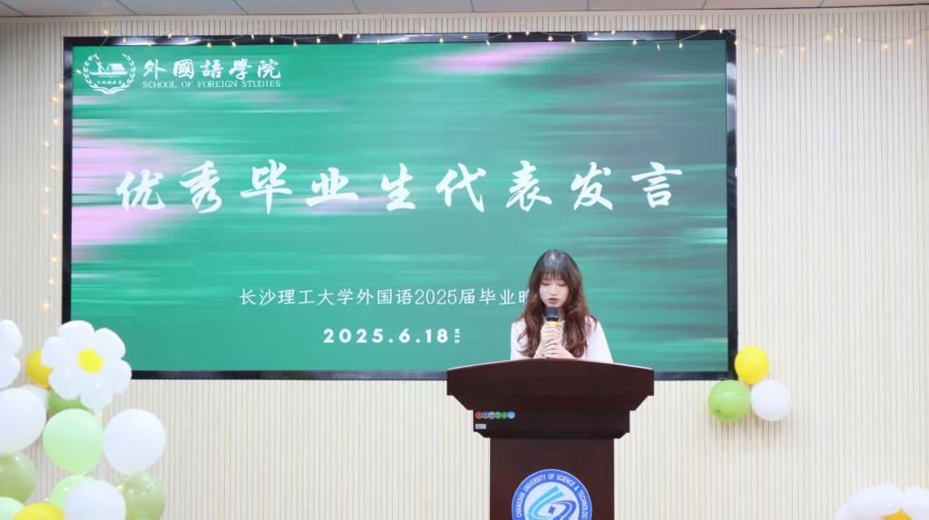 第二篇章“星耀逐梦夜”聚焦榜样力量与青春活力。张志武老师宣读了关于聘任外国语学院2025届校友联络员的决定,陈仁凯书记、段胜峰院长分别为郭亮、杨宇佳等6名校友联络员颁发聘书和授旗。随后,副院长姚尧和陈菁老师为湖南省优秀毕业生颁发了荣誉证书,研究生成敏瑶和本科生贺梦洁同学作为湖南省优秀毕业生代表逐次进行了发言,分享了他们在求学过程中的成长感悟。许宏蕾等同学深情献唱《明天会更好》、张俊威等同学的舞蹈“Savage”点燃全场。第二轮抽奖过后,晚会步入终章。
