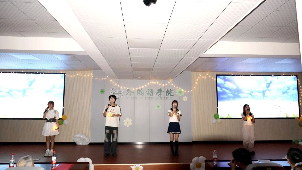 618日晚,外国语学院“青春不散场,星帆向未来”2025届毕业晚会在三教321报告厅隆重举行。学院党委书记陈仁凯、院长段胜峰、党委副书记周芳、副院长姚尧、党委委员陈菁、冯春、张志武、专业教师、毕业班班主任、学工办全体辅导员,特邀嘉宾郑延国教授、陈建生教授以及全体毕业生共同出席,晚会共分为“风来相逢时、星耀逐梦夜、帆起远行日”三个篇章,2021级本科毕业生曹晶晶级2024级本科生刘鑫担任主持。