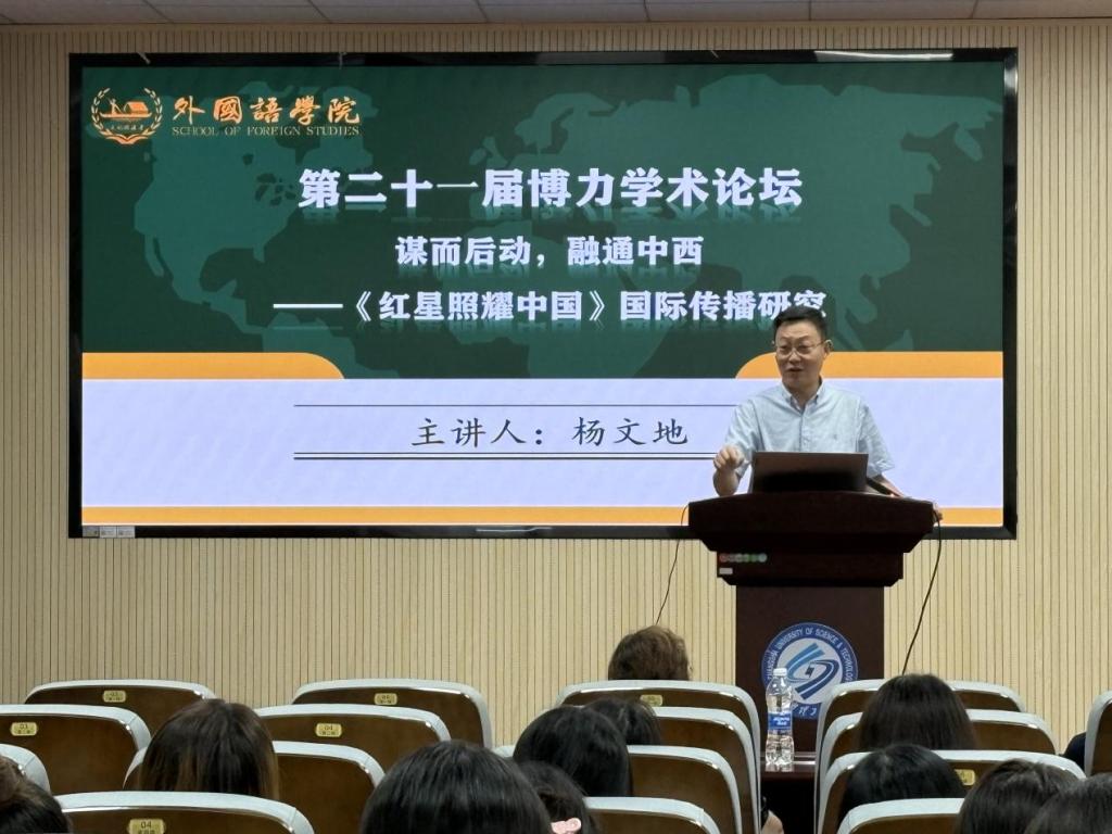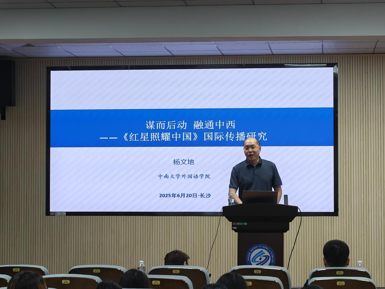 讲座伊始,姚尧对杨文地教授的到来表示了热烈欢迎与感谢,并简要介绍了他的学术研究经历。杨文地以《红星照耀中国》的国际传播为切入点,探讨了这部经典著作在跨文化传播中的深远影响,介绍了《红星照耀中国》的历史背景及其作为中国革命叙事重要文本的全球意义。他指出,该书能在海外产生广泛影响,得益于其真实客观的报道风格。杨文地从文本语言风格、写作范式的创新及读者友好的写作形式等方面进行了深入剖析。他强调,《红星照耀中国》的成功传播在于其内容的价值和以及作者将中西文化差异同写作技巧的巧妙融合,实现了跨文化对话的有效传播。