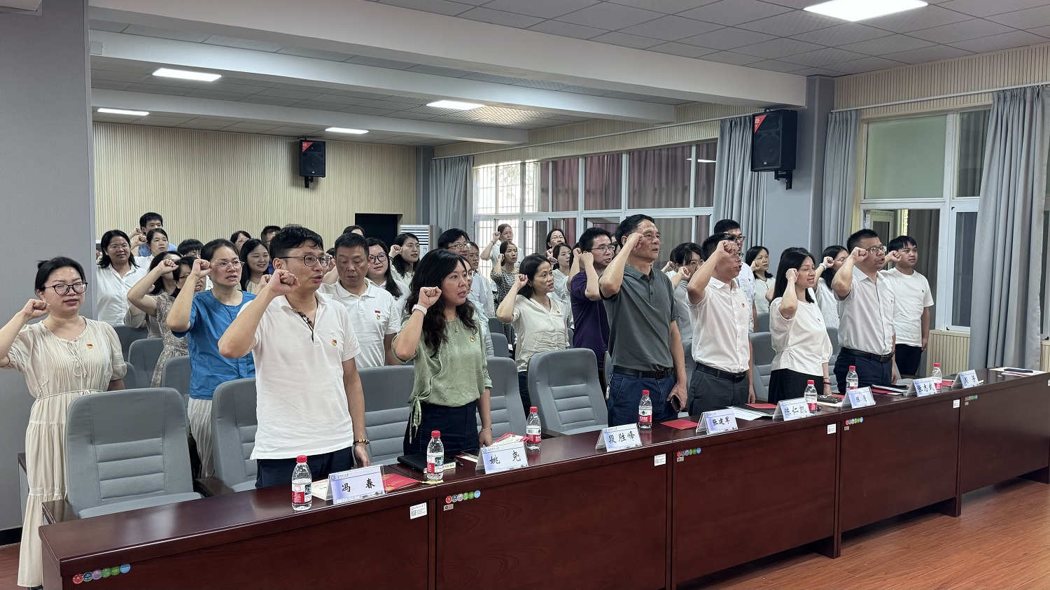 党委副书记周芳带领新党员宣誓,全体师生党员共同重温入党誓词。