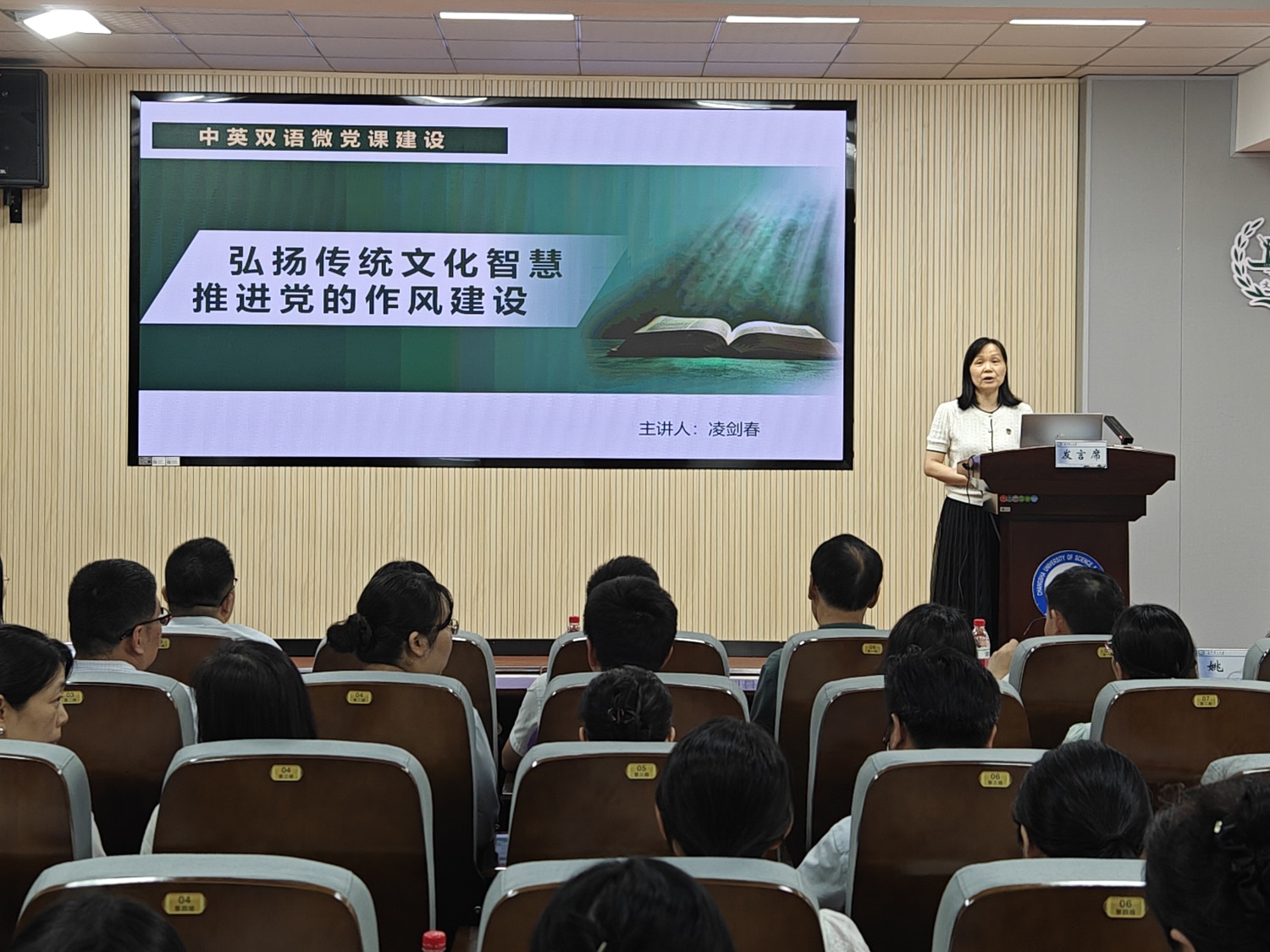 在表彰大会之前,优秀微党课一等奖获得者凌剑春同志为全体党员上了一堂题为“弘扬传统文化智慧 推进党的作风建设”的微党课,这是公共外语一教研室党支部中英双语微党课建设的成果之一。全体党员跟随凌老师的讲授,从中华优秀传统文化中汲取作风建设的养分,以中西文化互鉴的方式进行了党课学习,以外语人的方式庆祝党的生日。