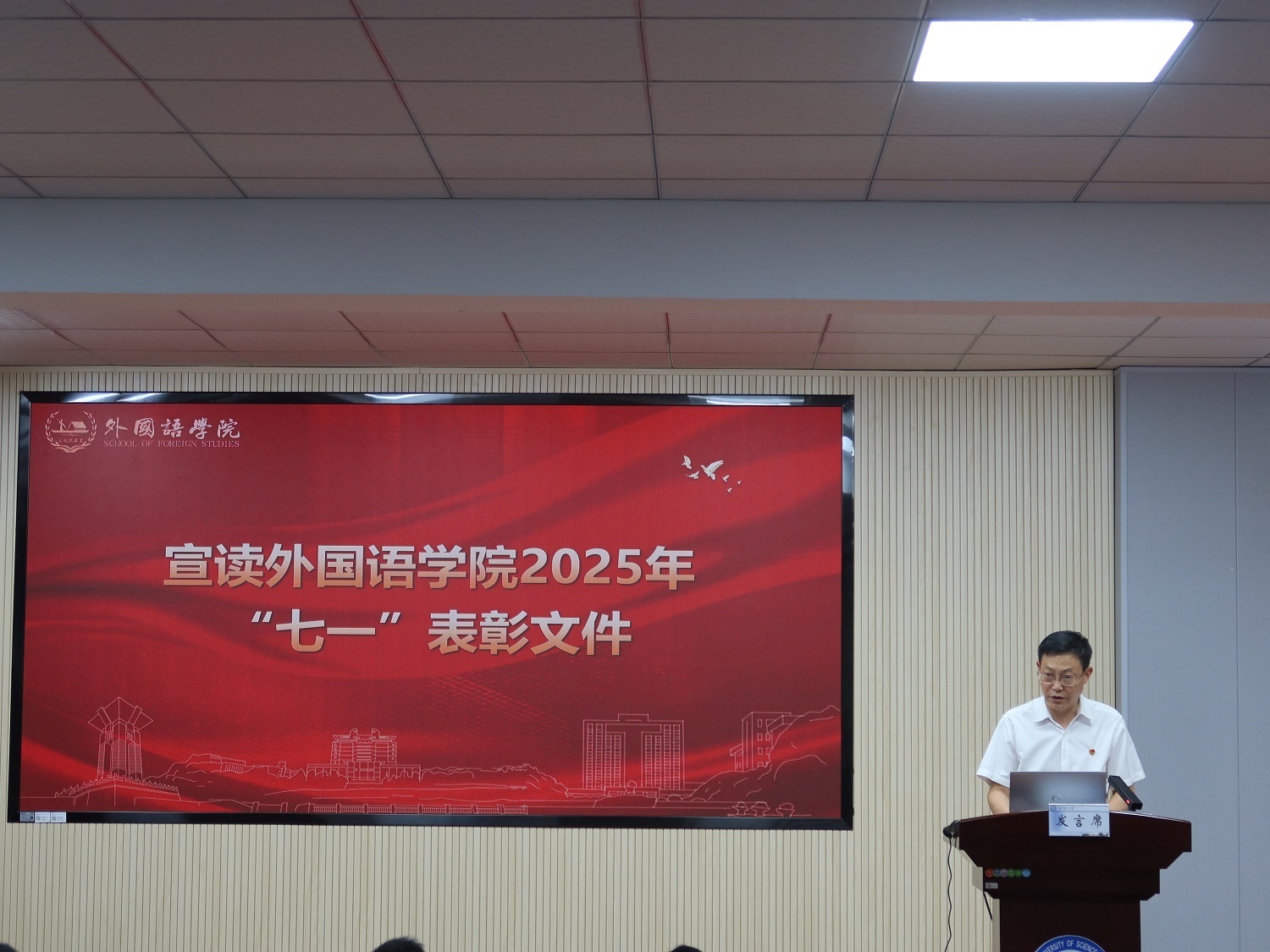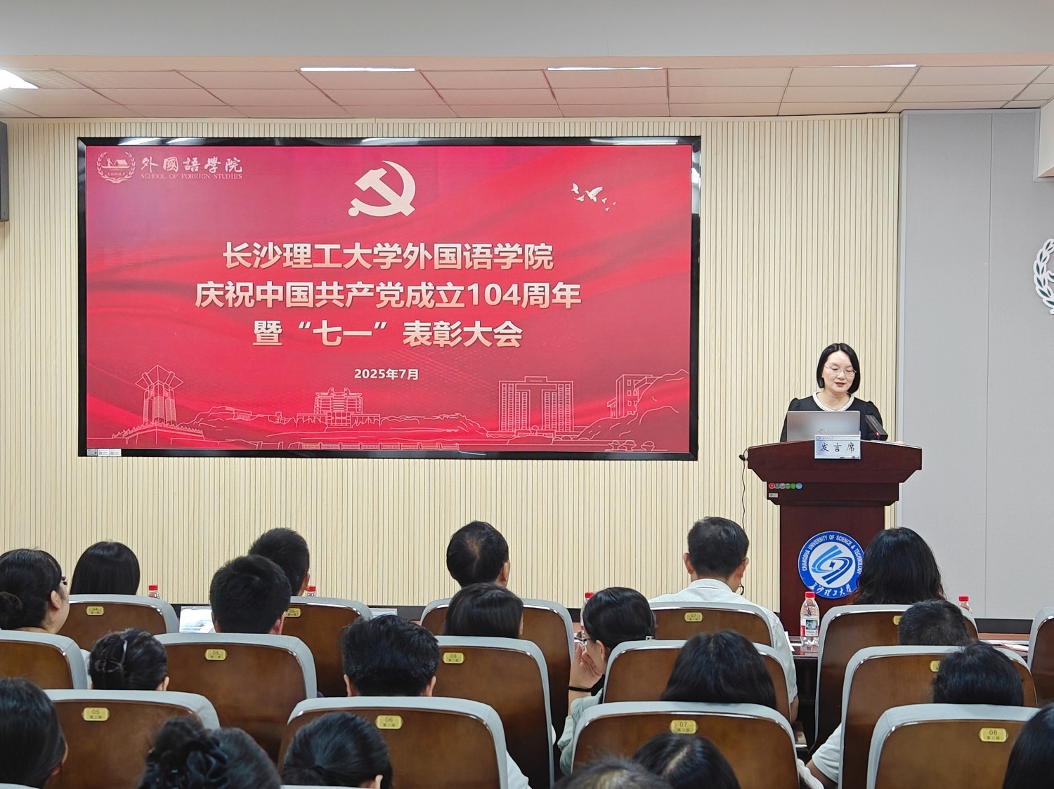 7月1日,外国语学院在321报告厅召开庆祝中国共产党成立104周年暨“七一”表彰大会。150余名师生党员、入党积极分子参会,学院党政班子全体成员和校党委组织部特邀组织员张建军同志等出席。
