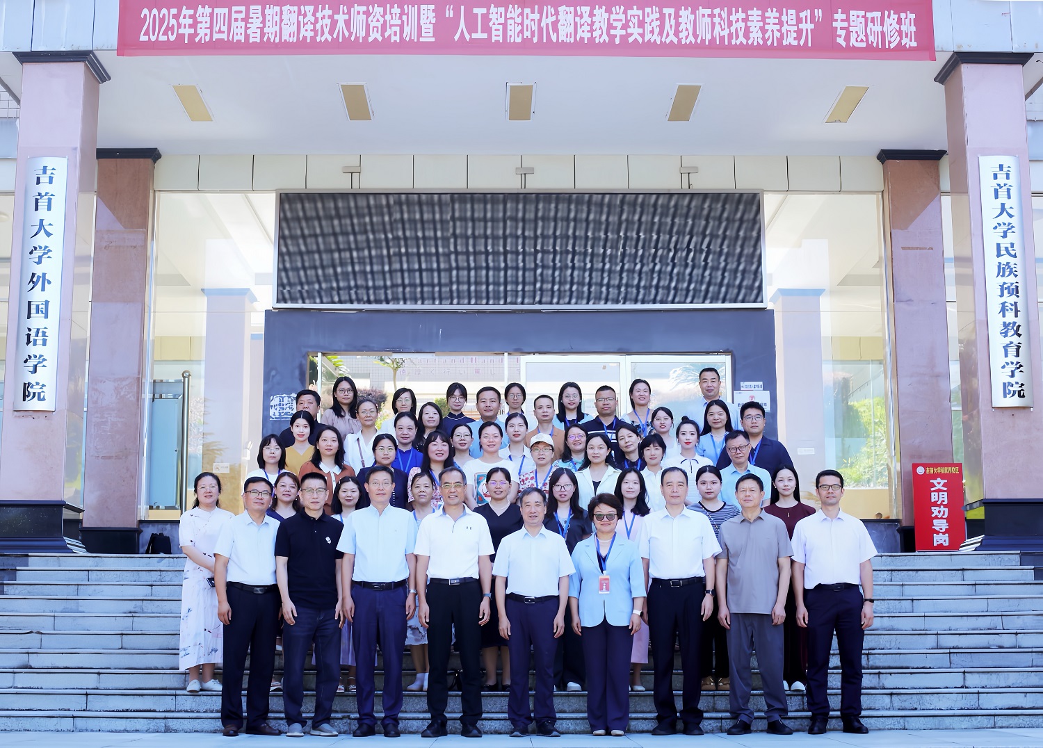 为深入贯彻落实国家关于人工智能发展的战略部署,提升翻译师资科技素养,服务国家翻译能力建设和湖南“三高四新”战略,湖南省科技翻译工作者协会(以下简称协会)于2025年7月26日至31日在吉首大学张家界校区成功举办“2025湖南省第四届暑期翻译技术师资培训暨‘人工智能时代翻译教学实践及教师科技素养提升’专题研修班”。本次研修班由协会主办,吉首大学外国语学院、长沙雅凌网络科技有限公司联合承办。