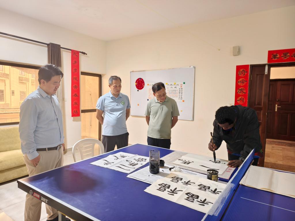 慰问过程中,尹大使一行走进课堂,现场观看学生学习情况。王朗同学展示了毛笔书法,其笔法沉稳、结构规范,充分体现了孔院在语言教学与文化融合方面的成效。尹大使对学生的表现给予高度评价,充分肯定了孔院教学成效,并鼓励学生继续深入学习中文和中国文化。