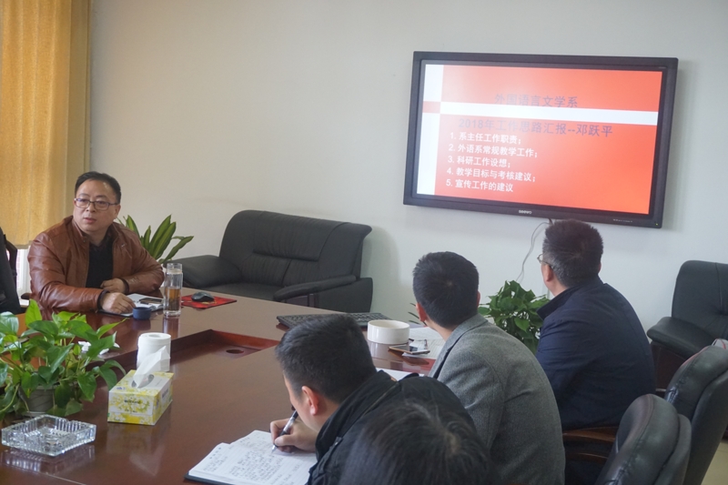 首先,外国语言文学系主任就对系主任工作的理解,系常规教学,科研工作设想,教学目标与考核,宣传工作建议进行了汇报;接着公共外语基础部、提高部主任及各科室主任也分别陈述了各部门2018年工作思路。大家用PPT、集体讨论方式,就学院发展及绩效考核等广大教师关切的问题,出谋划策,畅所欲言。