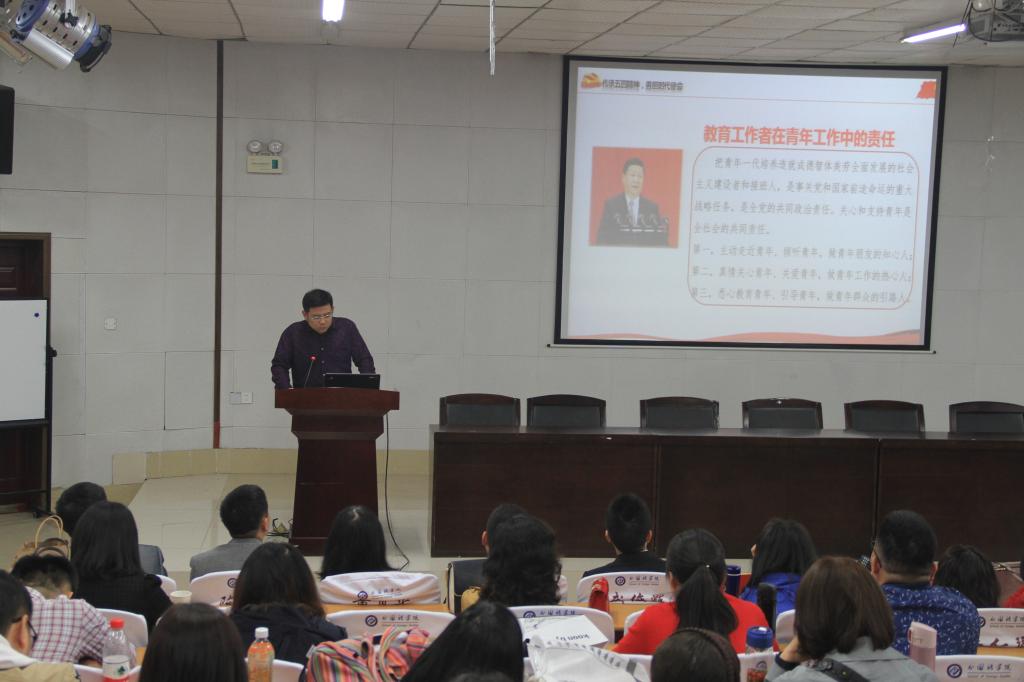 5月7日下午,外国语学院党委由副院长武俊辉以“传承五四精神,勇担时代使命”为主题,组织党委中心组(扩大)学习了习近平总书记在纪念五四运动100周年大会上的讲话精神。学院全体党员干部和部分群众参加了学习。