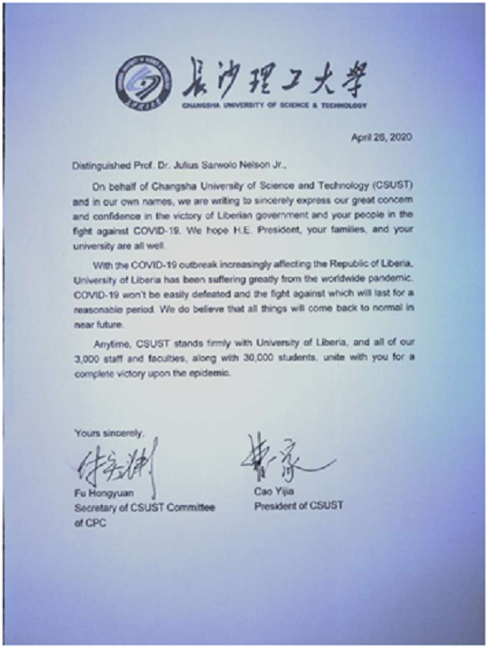 柳晓辉代表学校宣读了党委书记付宏渊、校长曹一家给利大校长尼尔森的亲笔慰问信。威廉体育领导在信中对尼尔森校长和利比里亚大学致以了真诚的问候,并表示守望无远近,威廉体育williamhill全体师生会坚定地同利比里亚大学站在一起抗击新冠肺炎疫情,也相信利比里亚政府会带领利比亚人民战胜疫情,在不久的将来,利比亚大学的一切工作与生活都将恢复常态。