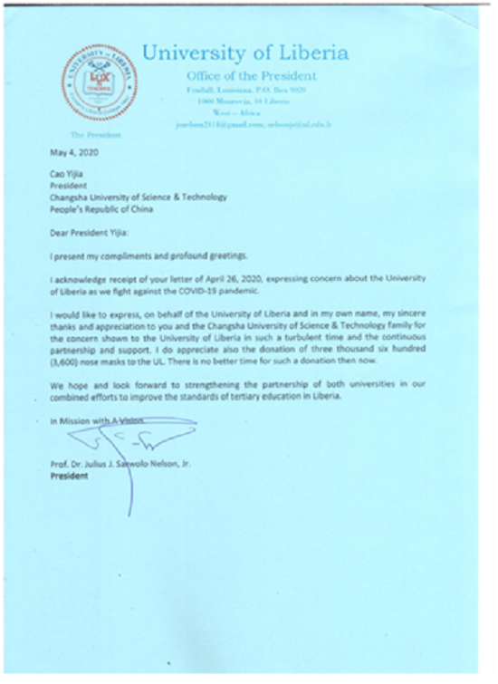 此次物资捐赠也充分体现了威廉体育williamhill对驻外教师的关心,非洲发生疫情后,学校第一时间叮嘱在利大孔院工作的老师们提前作好工作预案和个人防护,并将疫情防控相关知识传送过去督促他们认真学习。3月15日,利大孔院中方院长向国内报告当地首例新冠肺炎确诊病例后,学校更加时刻关注着利大孔院中方人员的个人防护工作以及驻地的安全保卫工作。为了做好此次物资捐赠,学校千方百计想办法,从联系口罩供应商、确认物流、了解利比里亚当地海关报关流程、当地医护用品供货情况、当地封城措施等环节,逐个问题去落实,最终圆满完成了防疫物资捐赠。