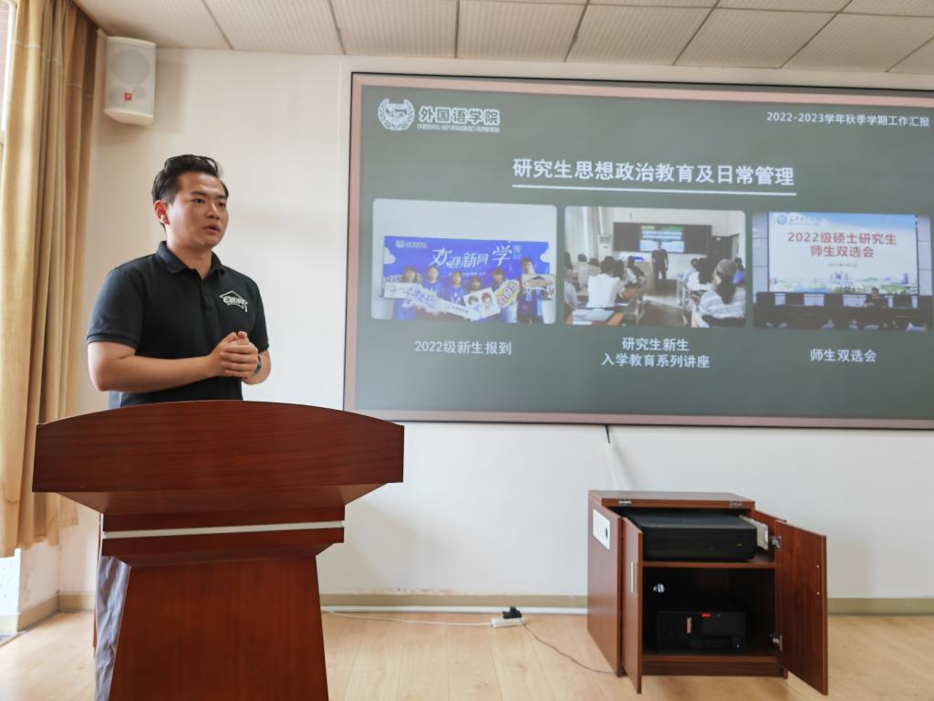 陈若晨汇报本学期研究生思想政治教育及日常管理、创新创业教育、网络思政三部分工作设想。强调在研究生中选树一批先进典型、打造特殊育人体系,进一步转化项目实践成果,力争在春季学期的创新创业竞赛中取得突破。