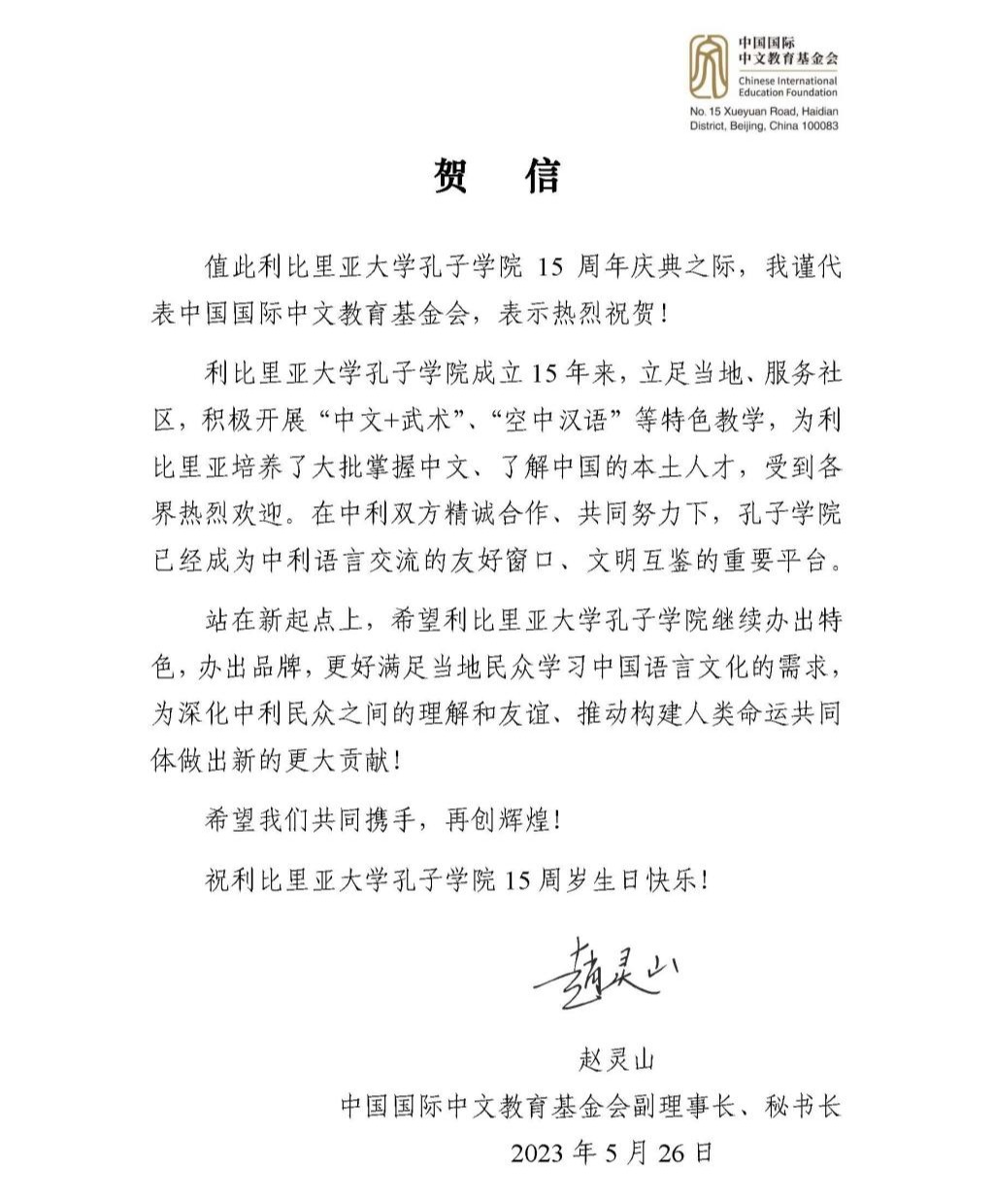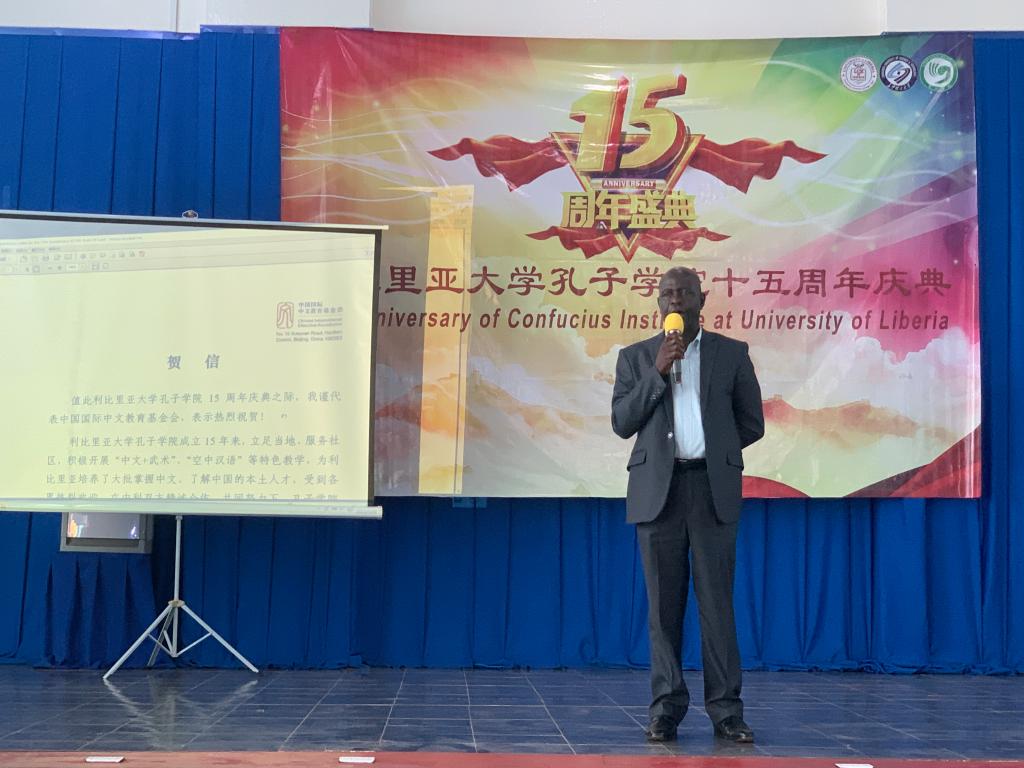 中国国际中文教育基金会副理事长、秘书长赵灵山发贺信祝愿利比里亚大学孔子学院15周岁生日快乐。他在贺信中提到,利比里亚大学孔子学院成立15年来,积极开展“中文+武术”“空中汉语”等特色教学,为利比里亚培养了大批掌握中文、了解中国的本土人才,受到各界热烈欢迎。他希望利比里亚大学孔子学院继续办出特色,办出品牌,更好地满足当地民众学习中国语言文化的需求。
