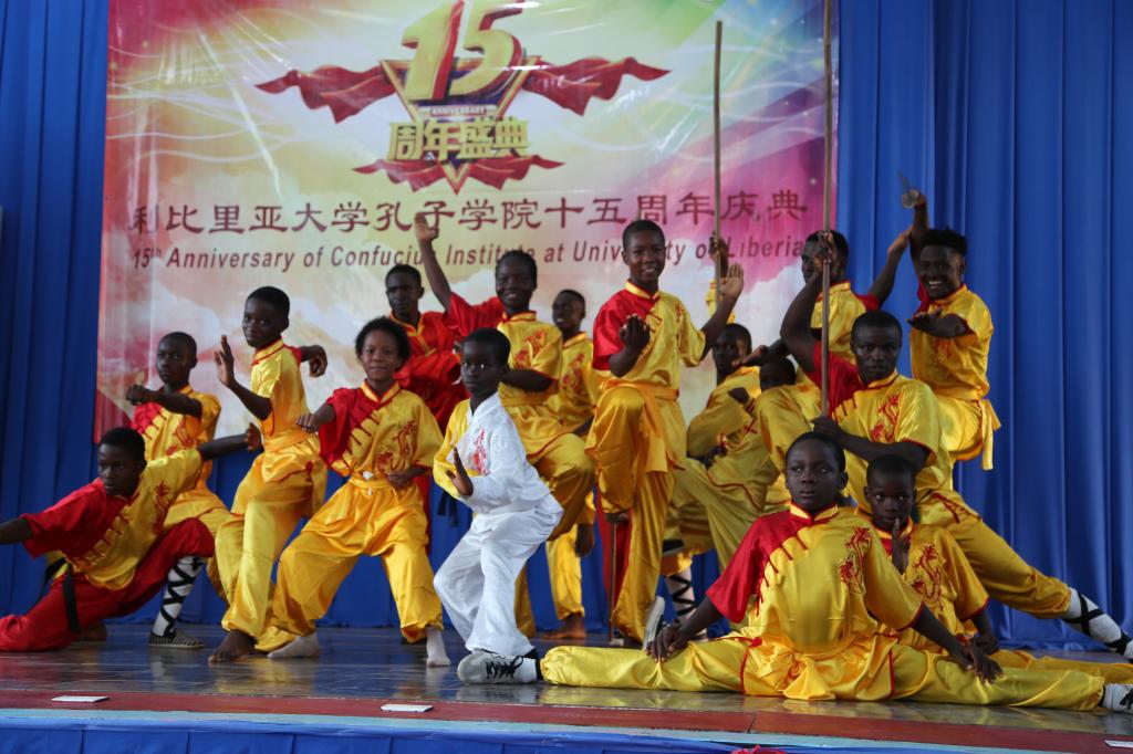在庆典活动中,利比里亚大学孔子学院的师生进行了精彩纷呈的文艺表演。教学点圣语中学的学生们,载歌载舞地表演了《朝代歌》,他们发音标准,口齿清晰,令嘉宾们赞不绝口;圣语中学的女孩子们表演了中国舞蹈《有位姑娘》,她们身姿柔美、灵巧可爱,极富中国舞蹈的神韵;利大孔院武术学校的学员们表演了精彩的武术节目,赢得了雷鸣般的掌声,将全场气氛推向了最高潮。