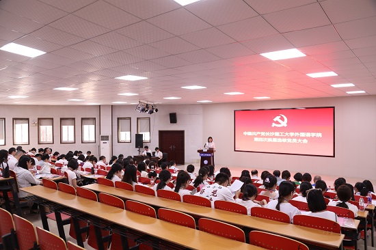 校党委委员、副校长蒋璟萍,党委组织部副部长靳攀科,学院老领导郑延国、陈建生、覃先美、李冀宏、熊丽君受邀出席大会,外国语学院各师生党支部共计87名党员参加大会,大会由外国语学院院长段胜峰主持。