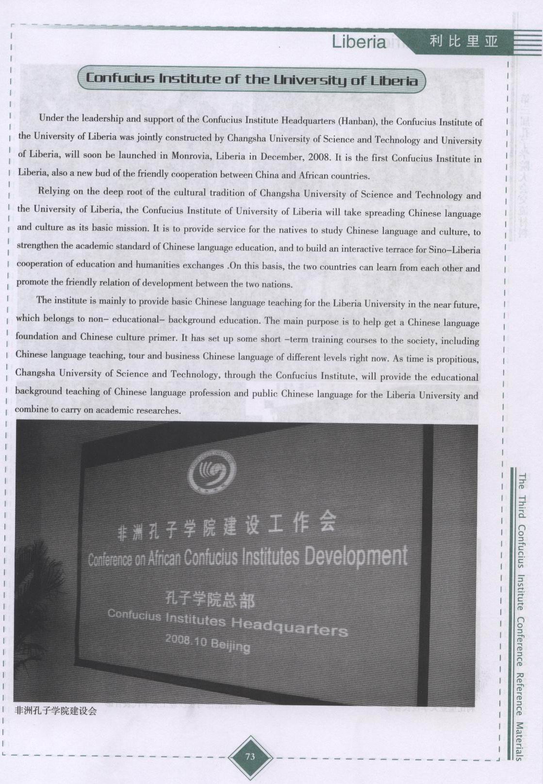 Under the leadership and support of the Confucius Institute Headquarters (Hanban), the Confucius Institute of the University of Liberia was jointly constructed by Changsha University of Science & Technology and University of Libera, will soon be launched in Monrovia, Libera in December, 2008. It is the first Confucius Institute in Libera, also a new bud of the friendly cooperation betweenChinaand African countries.