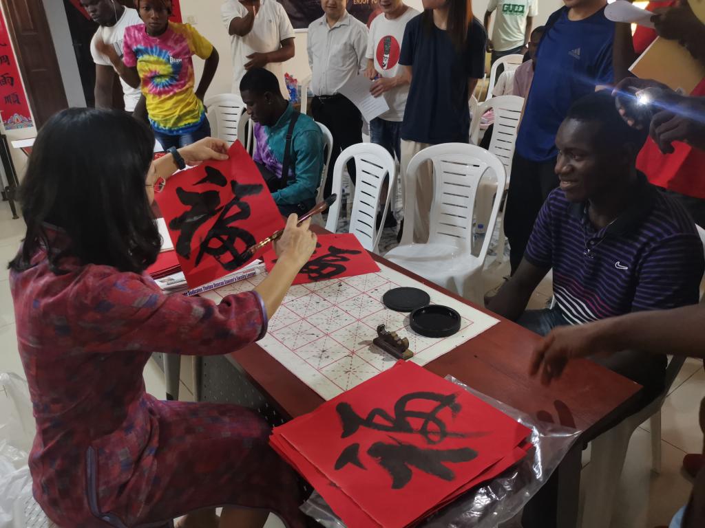 接下来,周红专院长教大家写毛笔字。她首先给大家介绍了春节中国人倒贴“福”字的习俗,然后一笔一划展示了“福”字的写法。学生们纷纷拿起毛笔,描摹学写“福”字。在周院长的指导下,蘸墨、落笔、收笔,做得有板有眼,写出来的“福”字也非常工整漂亮。周院长告诉同学们可以把写好的“福”字带回去贴在自家大门上,在利比里亚过一个福气满满的中国年!