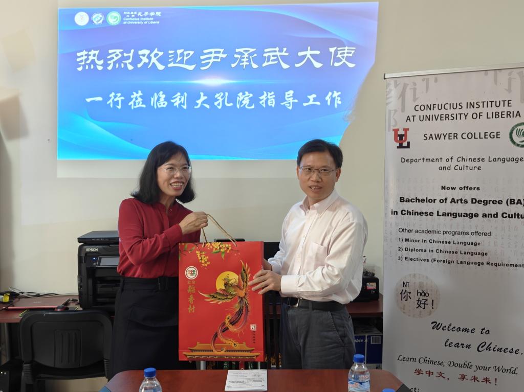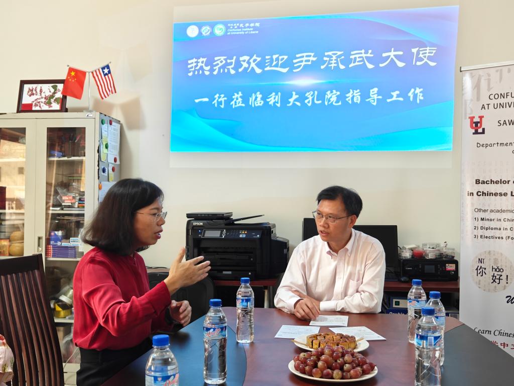 周红专院长感谢尹大使不顾旅途劳顿,一抵利履新就走访孔院,是“外交为民”的生动体现。她向尹大使汇报了利大孔院国际中文教育的现状,尤其是近期所取得的里程碑式的成就——中国语言文化本科专业的获批和正式启动。利大孔院所取得的这些成就离不开使馆的鼎力支持与帮助。利大孔院今后将继续努力提升利比里亚中文教育水平,争取把中国语言文化本科专业办成利比里亚大学最受欢迎的专业之一。