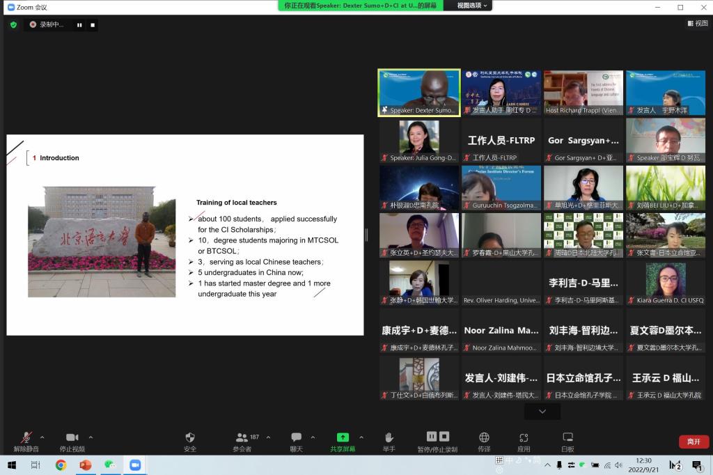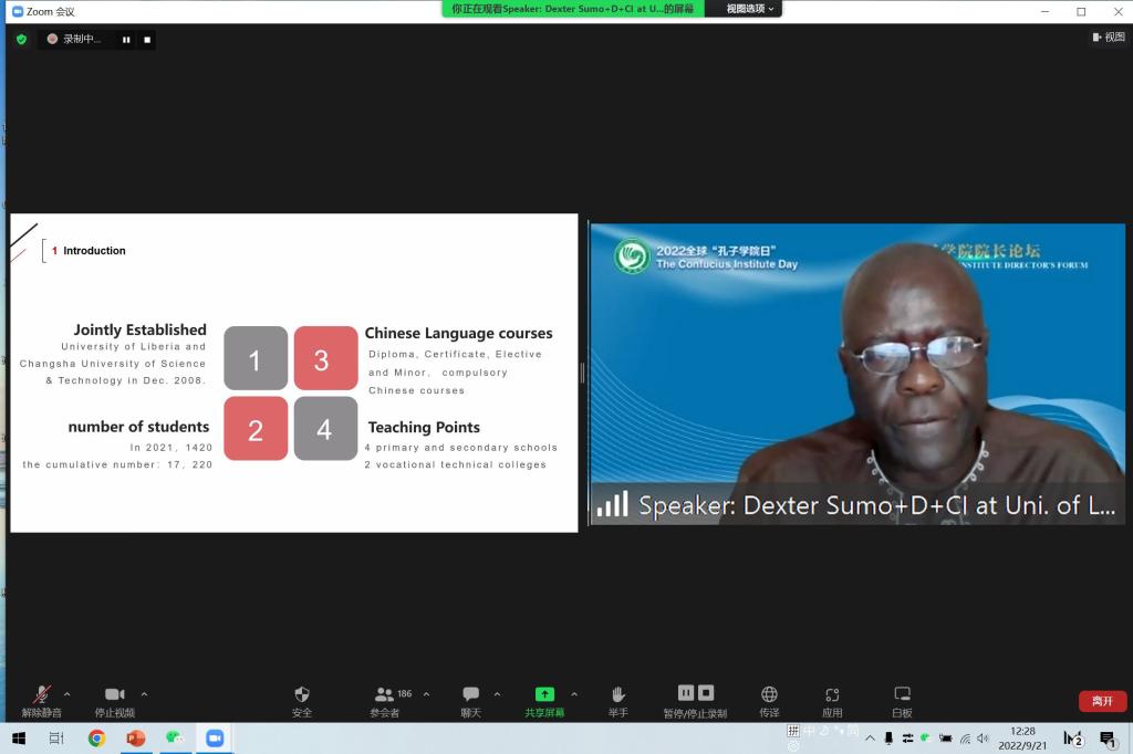 作为全球“孔子学院日”系列活动之一,由中国国际中文教育基金会联合北京外国语大学主办的“2022 年孔子学院院长论坛”于9月14日至24日举办。本次孔子学院院长论坛旨在进一步加强全球孔子学院间的协同合作,夯实孔子学院内涵式发展的基础,共同探讨未来可持续高质量发展之路。论坛包括2场专题讲座及3场分论坛研讨,近600名中外方院长报名参与,26位院长做主题发言。院长们畅所欲言,各抒己见,就孔子学院如何提升师资质量、孔子学院如何更好服务当地社会、塑造品牌形象、孔子学院如何因地制宜谋发展等议题发表自己的看法。9月21日,利比里亚大学孔子学院利方院长SUMO应邀在论坛上做题为“如何解决利比里亚孔子学院面临的制约问题”的主题发言。