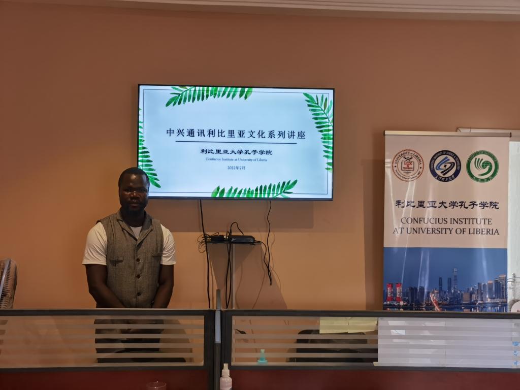 为助力中资企业减少中利交流障碍,帮助中资企业员工更好地了解利比里亚语言与文化,当地时间7月2日,利比里亚大学孔子学院中方院长周红专携教师代表来到中兴通讯利比里亚代表处,为该公司员工举办了首场利比里亚文化专题系列讲座。中兴通讯利比里亚代表处李刚球经理、刘兴旺经理及代表处多位技术专家听取了讲座。大家纷纷表示获益匪浅。