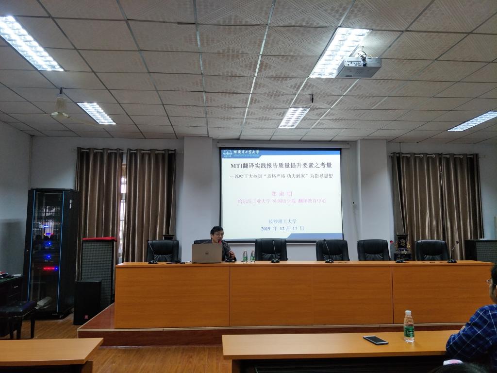 1217下午3点,哈尔滨工业大学郑淑明教授应邀莅临我,在金盆岭校区2201为我院师生开展了题为MTI翻译实践报告质量提升要素之考量——以哈工大校训规格严格 功夫到家为指导新思想”的学术讲座。讲座由武俊辉副院长主持,部分硕导及全体硕士研究生参加了讲座