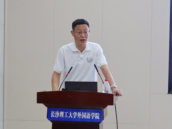 第五环节,段胜峰作主题教育调研汇报,他讲述从6月15日至20日,学院领导率队就外语学科人才培养、工程英语学科建设发展、学生就业创业等问题赴重庆、四川、广东开展调研,先后调研了重庆交通大学、西南交通大学、广州狮子会、广州广高高压电器有限公司、佛山市恒力泰机械有限公司、奇拓集团、佛山外贸网商协会、广州梓柏印刷有限公司等。从调研过程与案例、结果分析、办学定位与特色、工作交流等四方面进行汇报。他指出,学院班子通过外出调研深入了解几所高校的整体状况,分析并总结它们的优势和短板,在此基础上,精准定位学院的发展方向和着力点。同时也了解外贸企业发展情况和用人需求,探讨院企合作模式,共同促进学生的实习就业和教学改革创新。